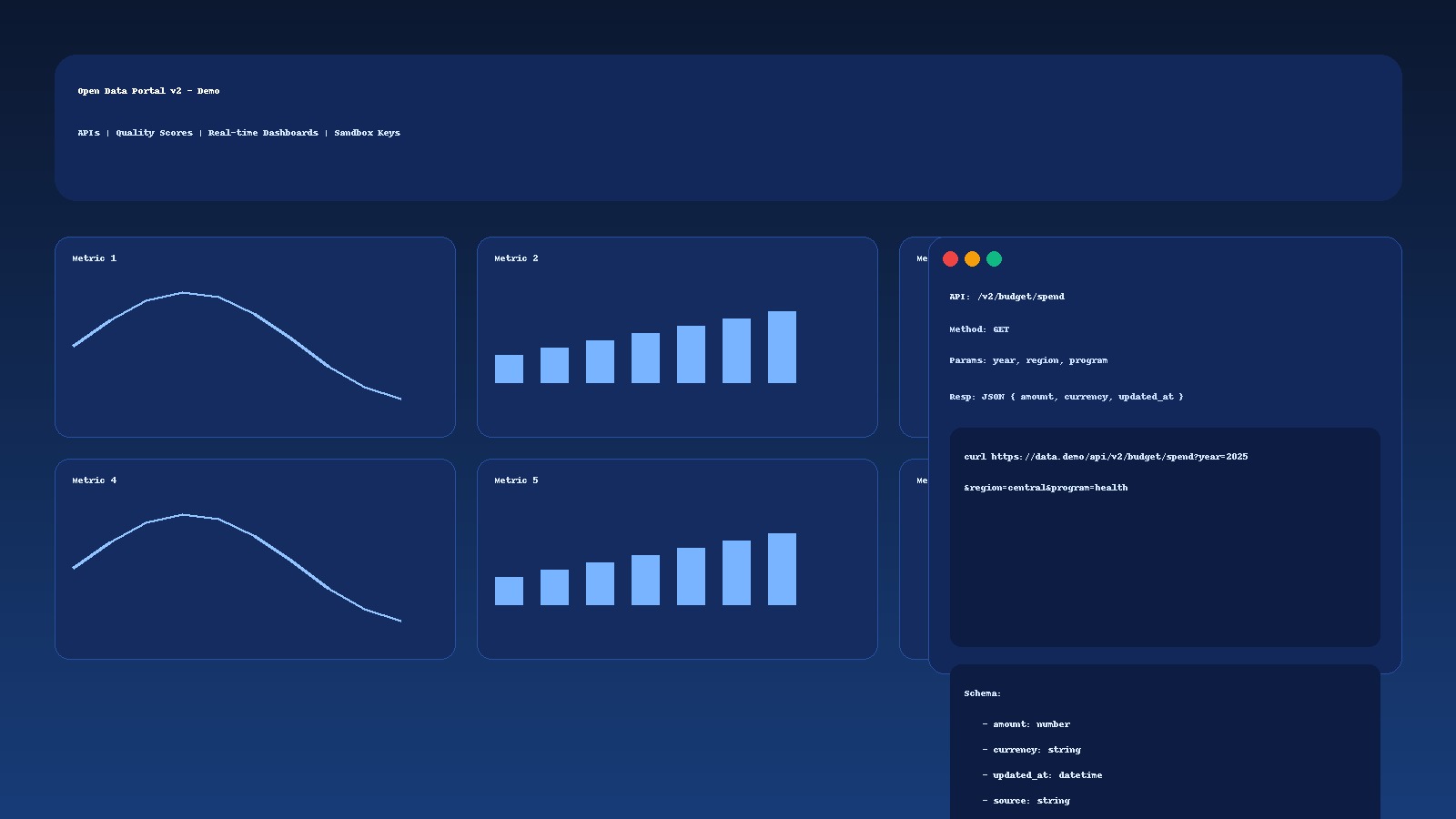 A faster, API-first portal launches with dataset quality scores, real-time dashboards, and developer sandbox keys—making public data easier to find, trust, and build on.
